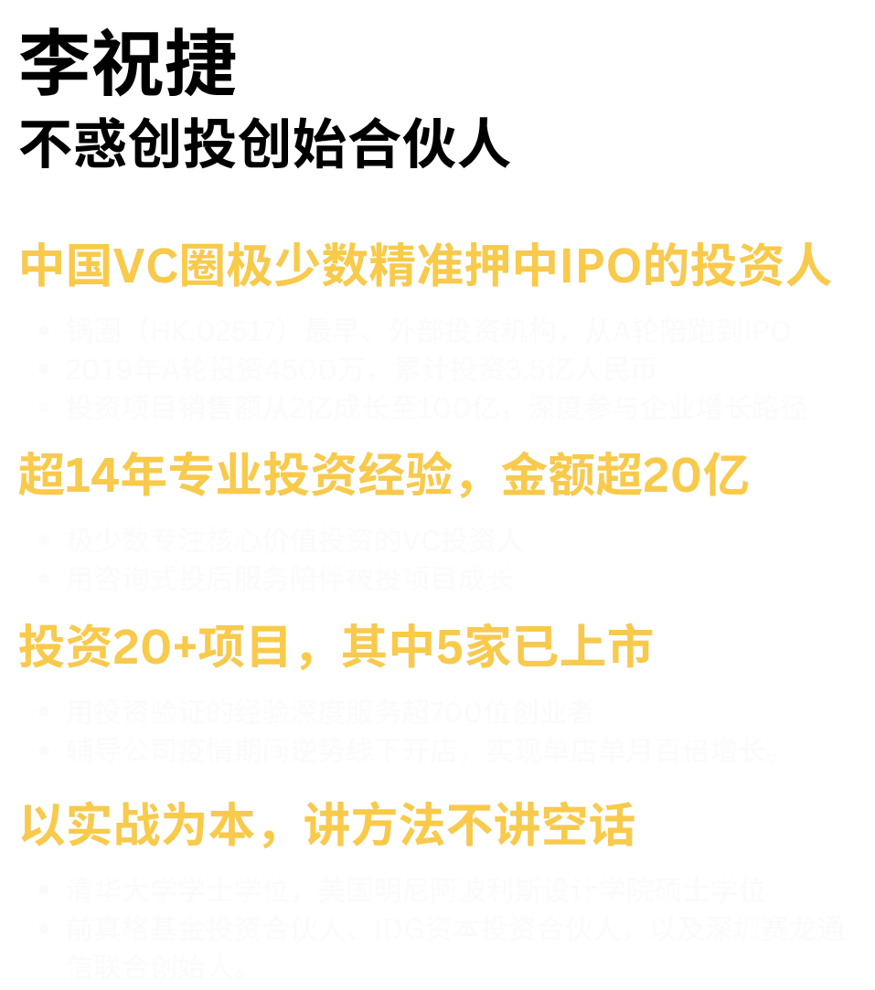 李祝捷导师已投出超过20家学员企业,并陪跑5家IPO上市。